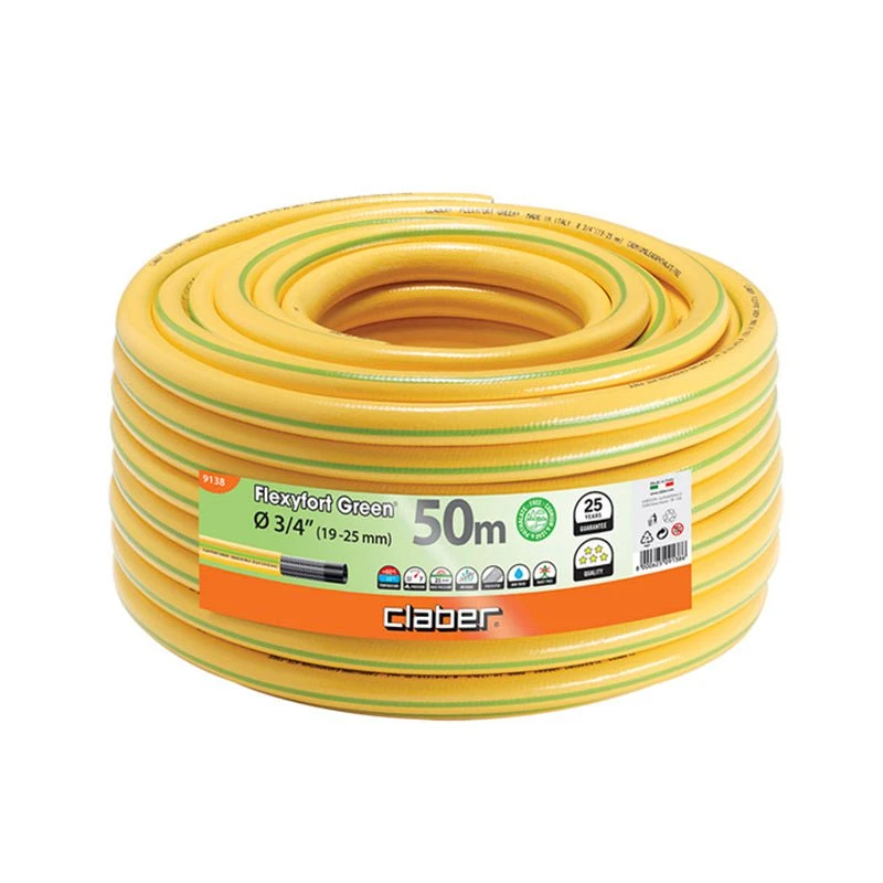 The Claber Flexyfort Green 3/4″ 50-metre hose is a high-quality kink-resistant hose with a special helix-pattern knitting reinforcement that guarantees excellent stability, even at high water pressure. The highly visible bright yellow colour makes this an ideal choice for use in commercial and agricultural applications.