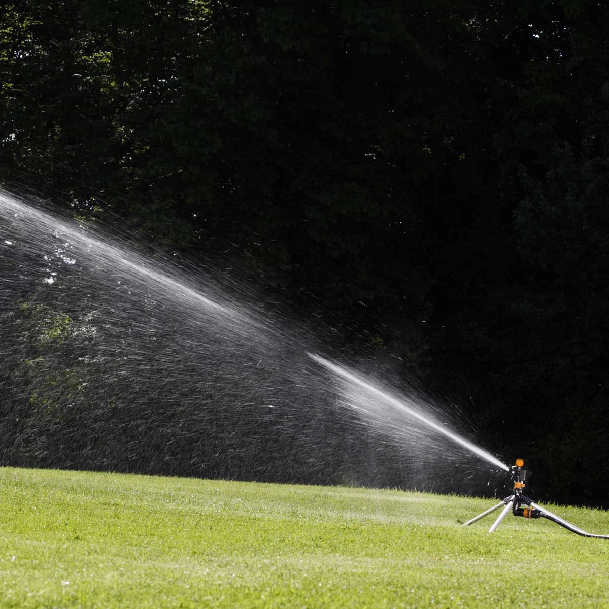 The Claber impact sprinkler on a small tripod is simple to use and provides an even water distribution for lawn areas with a diameter of up to 25 metres. The sprinkler head can be set to rotate between 0° to 360° circle coverage or to have continuous rotation. Mounted on a steady resistant steel tripod for easy placement and stability with minimal disruption to the lawn. A diffuser screw gives even water coverage, and an adjustment device is used to optimise the spray at high water pressures. Stainless steel pin, wear-resistant bronze bushing and tough plastic material ensures a long-life.