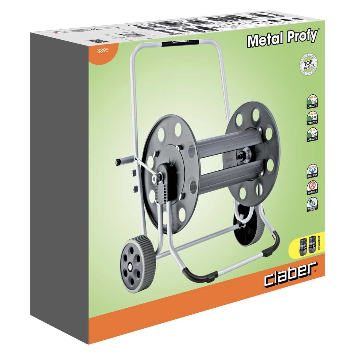 The Claber Metal Profy hose reel has all the features of the Claber Metal Gemini, and some extra features. The entire body is constructed out of metal with an epoxy resin coating for long life. The large wheels are covered in rubber for sure grip over rough and slippery terrain. Fitted with a silent block for preventing wear. This is ideal for heavy loads – a maximum capacity of up to 150 metres of 1/2″ garden hose. Comes as a self-assembly kit with the use of no tools.