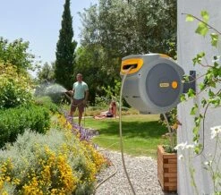 It is also supplied with everything required to fit this to an external wall (wall fixings and brackets) quickly and easily. When mounted to a wall, the drum has a 180° pivot allowing you to reach every part of your garden easily.