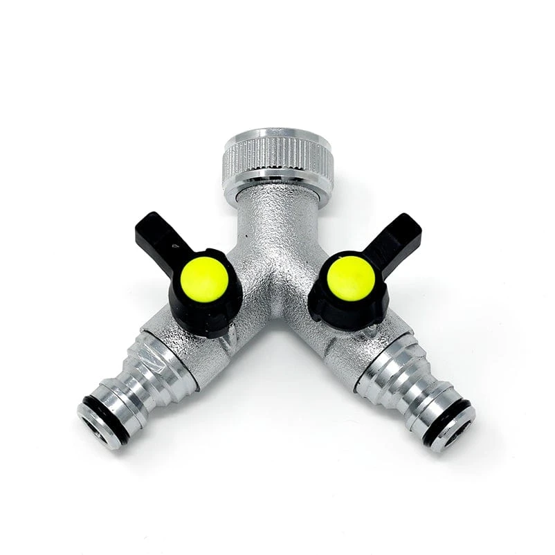 This connects directly to your outside tap and allows you to run two hoses at the same time. It also comes with the shut-off valves so one or both sides can be isolated. There are many brass hose fittings available, but we only stock the best. Quality and longevity is assured when buying from us. Can be used with any Hozelock style hose end connector. These brass hose fittings are generally used by professional gardeners, contractors and the horticultural trade for their reliability and strength.