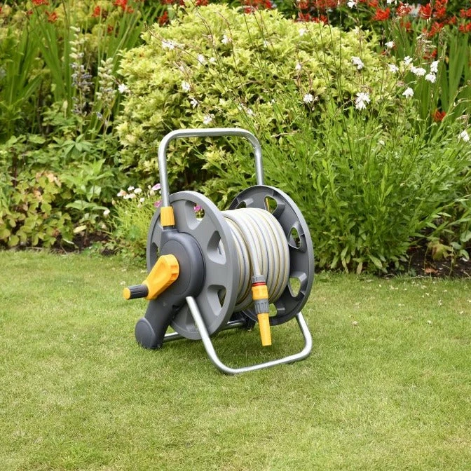 This pre-assembled Hose Reel comes complete with a 25-metre length of high-quality, multi-purpose garden hose and hose fittings, ready to use straight away. Its compact size, sturdy base and robust metal handle make it easy to carry and use. With a maximum capacity of 45 metres, this hose reel will be your companion for years to come. Made from the highest quality materials, the 45m capacity hose reel will stand the hard-wearing challenge of all tasks.