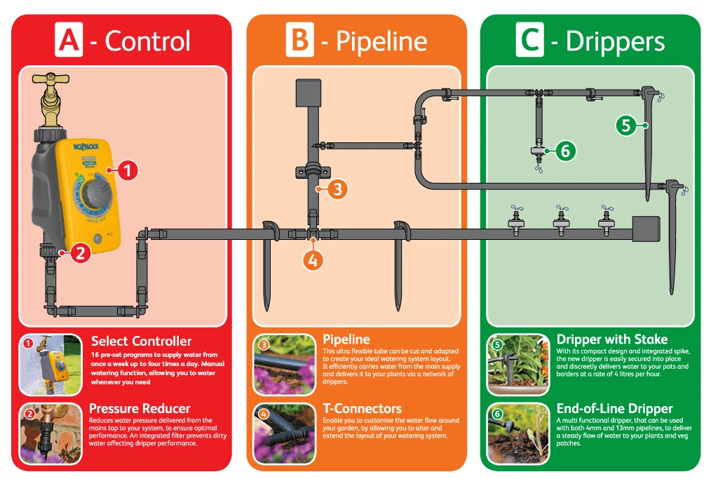• Pro Automatic Watering Kit with all necessary pipe, fittings and emitters – can be extended to meet larger requirements with the purchase of additional parts.