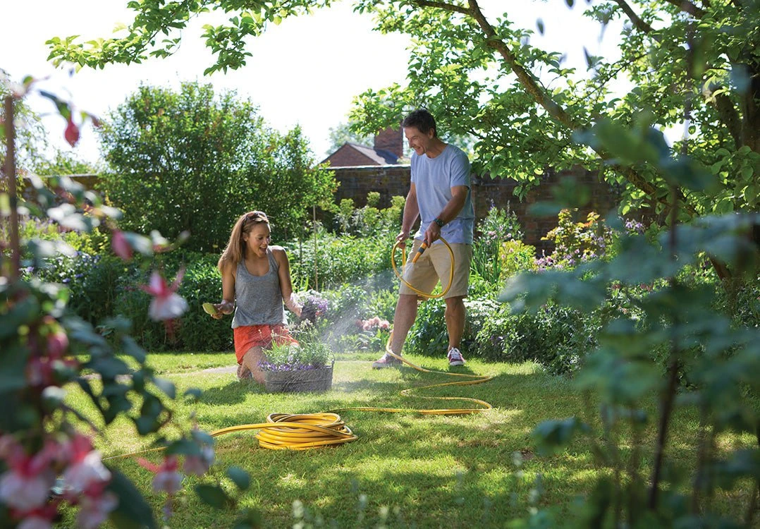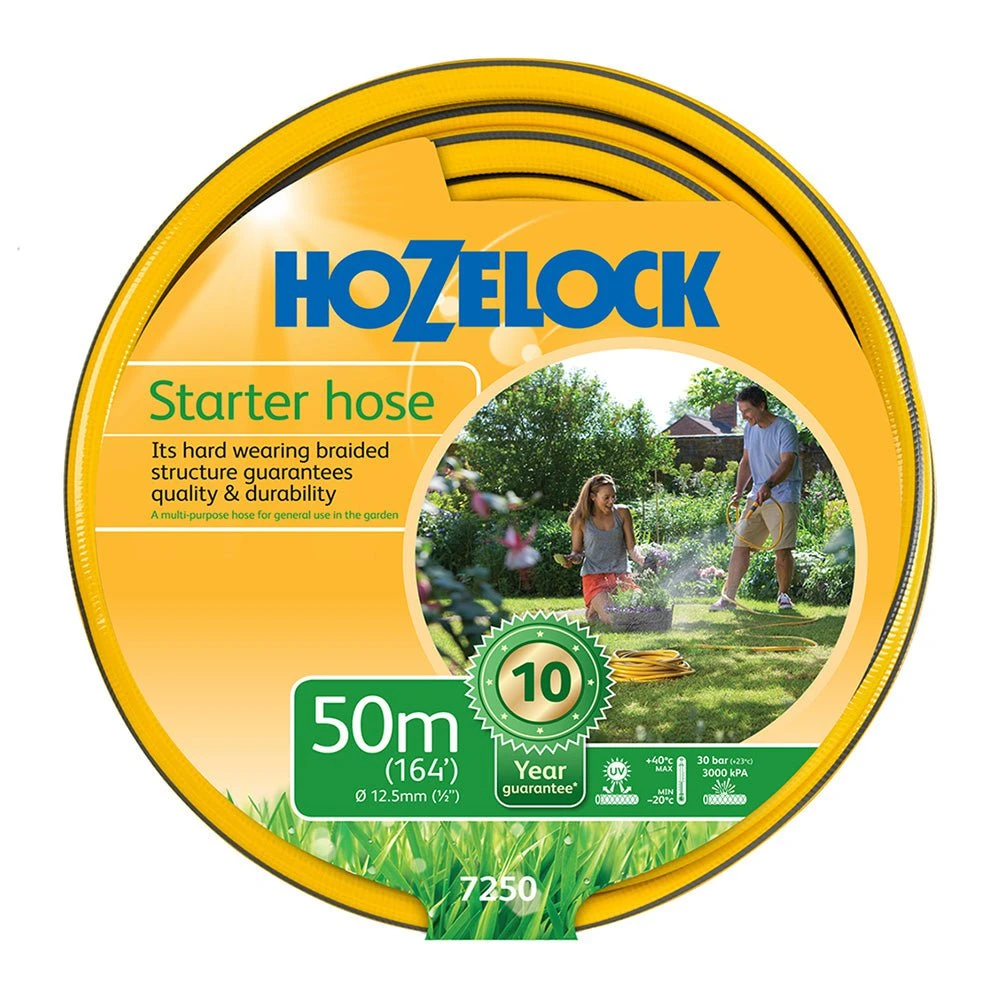 The Hozelock 50m starter hose is part of the cheapest Hozelock garden hose range, but don’t let that fool you, this is a quality hose that is great for general use in the garden. 3 layers of braided PVC make this a super strong and flexible hose. The braided layer stops expansion and warping, the smooth PVC inner layer allows the water to flow quickly, and the strong outer layer of PVC provides strength and durability.